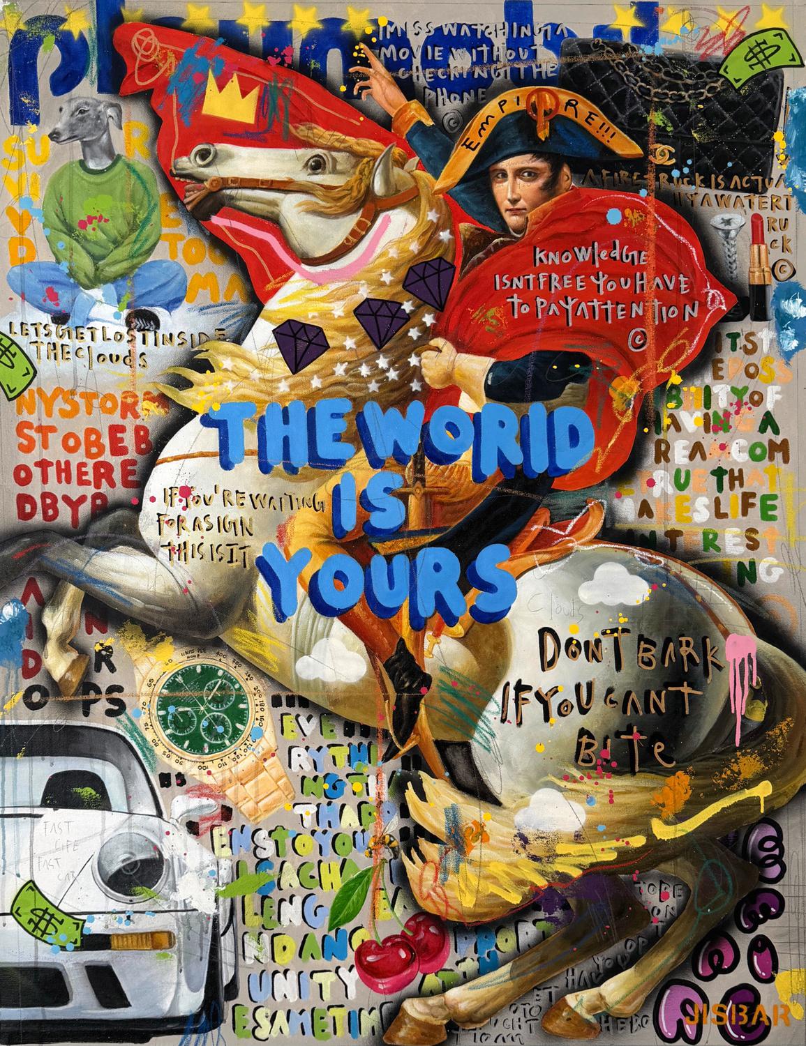 His art reflects contemporary society based on consumerism. He uses the most famous icons of art, music, fashion, cinema, cartoons and sport and reinterprets and translates these subjects in his own world. In fact, his paintings can be observed again and again to discover something new every time, including what he defines" moments of life ". These are personal memories that assume new meanings inside the works, and thanks to this transparency the observers can completely immerse and identify themselves in Jisbar's art.