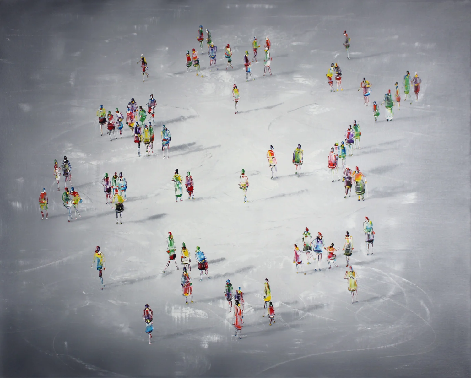 Forbes draws inspiration from human interaction — skating rinks, public pools, busy streets — translating these moments into richly textured canvases through a masterful use of impasto. His vibrant palette contrasts with minimal backgrounds, creating a striking dialogue between human presence and spatial abstraction.