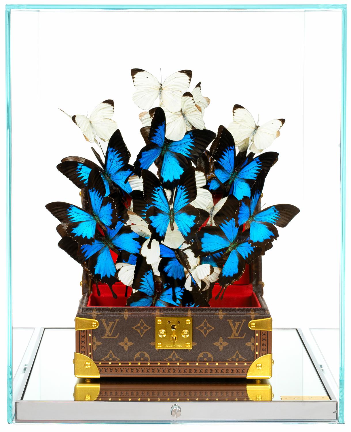 2024, Baule Louis Vuitton originale, farfalle naturali stabilizzate, teca in vetro e specchio, targhetta con firma incisa, 50x40x40cm